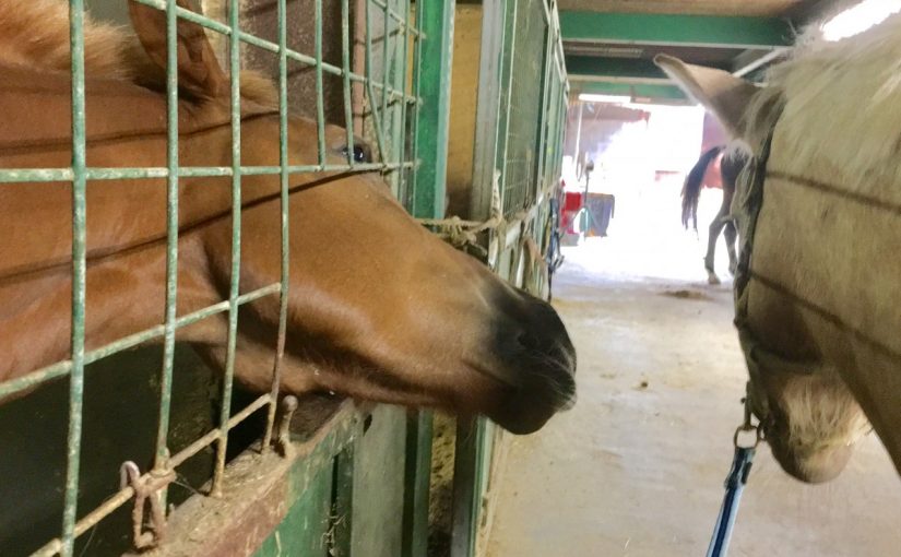 皆さんこんにちは!エルミオーレ豊田の森です!今日の天気は1日、くもり空でした。さて、今日の写真のテーマは「行かないでぇ~」です!写真に写っているのは、プニオ号と、ポニオ号です!ポニオ号が朝の運動に行くのを、必死に止めようと顔を出すプニオ号!しかし、ポニオ号はそのまま運動に行ってしまいました(笑)名前もよく似ていて兄弟のようですね☆本日も多くのお客様に御来厩いただき、有難うございました!!!